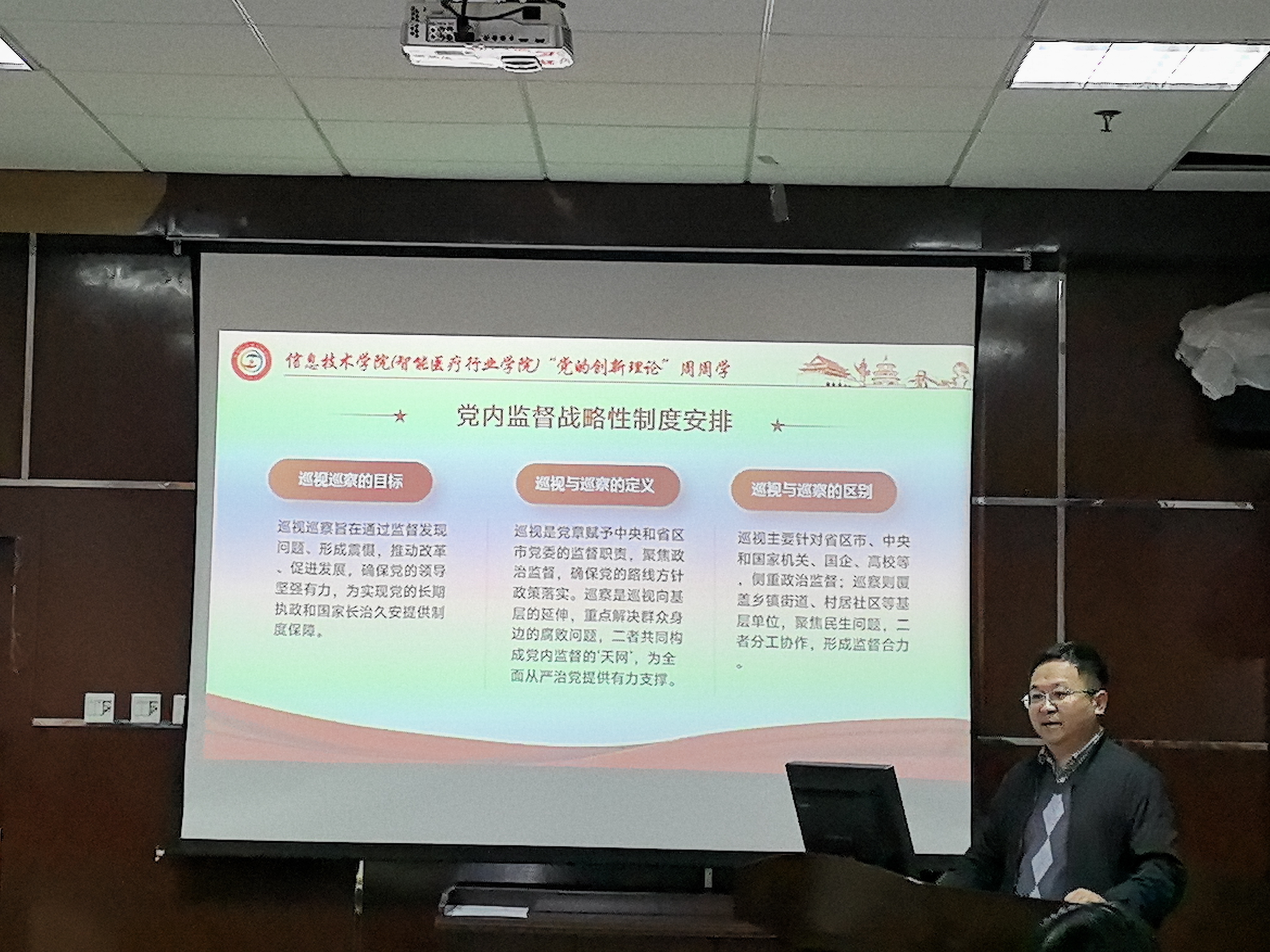 本网讯(文/图 刘培聪)2025年10月14日下午,信息技术学院(智能医疗行业学院)在综合教学实验大楼 A722 会议室依托“党的创新理论周周学”党建品牌,在校党委巡察组进驻之际,组织全院教职工开展巡视巡察工作专题学习。本次学习由学院党委副书记岳颀主持并领学。