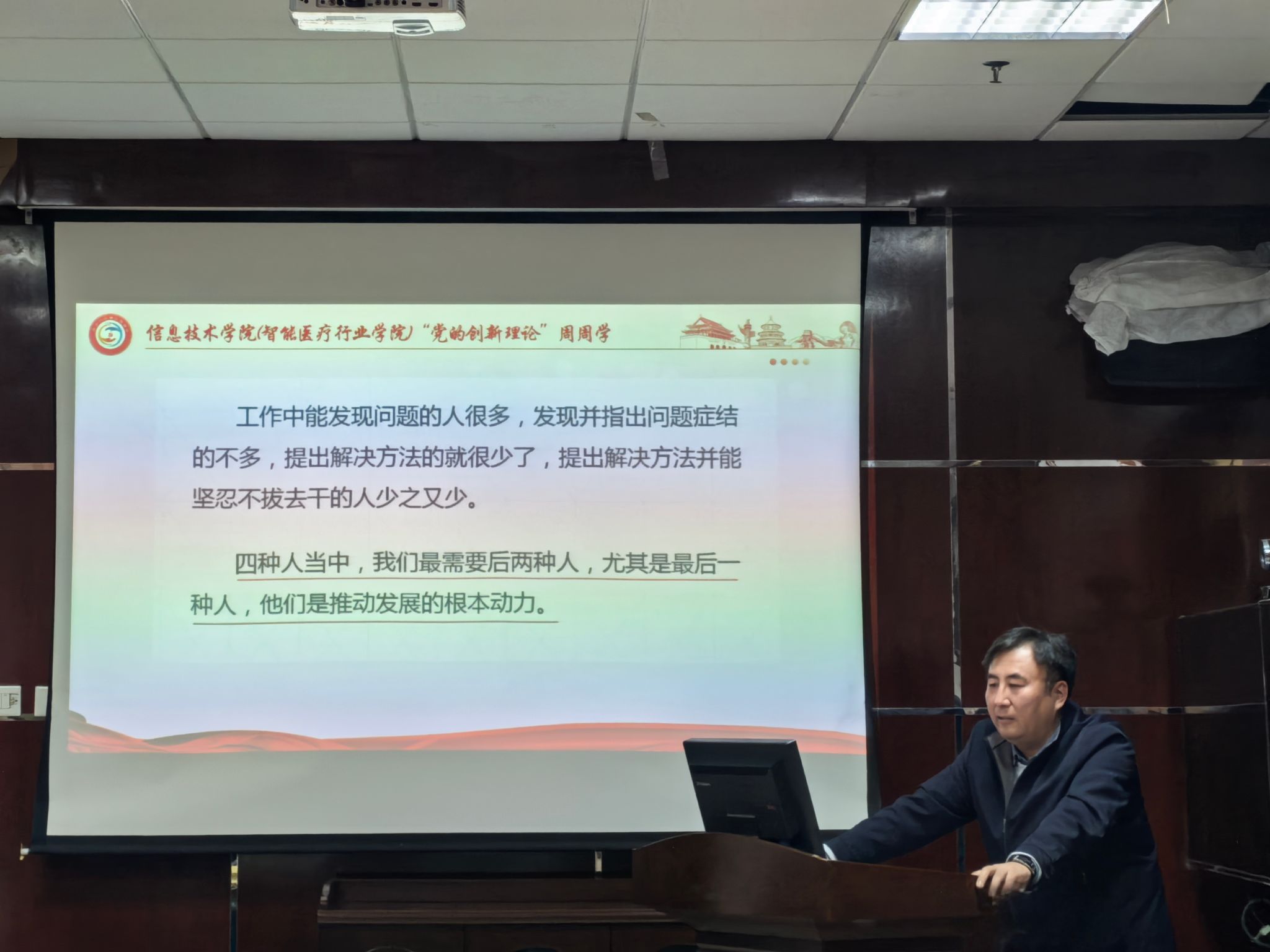 本网讯(文/图 刘培聪)2025年10月21日下午,信息技术学院(智能医疗行业学院)在综合教学实验大楼A722会议室,依托我院“党的创新理论周周学”党建品牌,由党委书记许成刚结合《习近平谈治国理政》(第五卷)学习内容讲授专题党课。学院领导班子及全体教职工参加,党课由党委副书记岳颀主持。