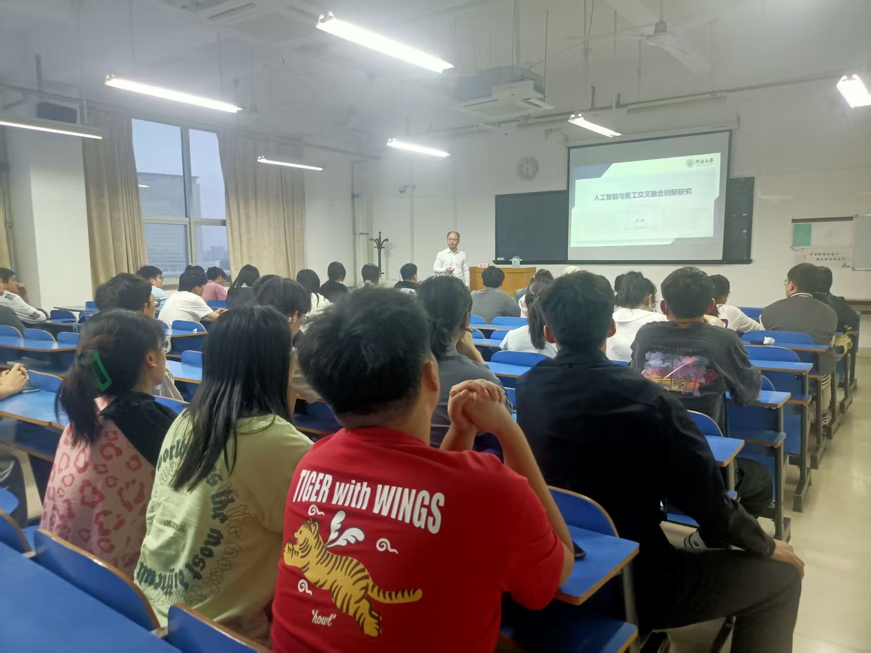 (文图/宋学坤)2024年5月15日晚,河南大学周毅教授应邀做客我校“百家论坛”并在教学实验大楼A705开展以“人工智能与医工交叉融合创新研究”为主题的学术讲座。河南中医药大学信息技术学院(智能医疗行业学院)院长许成刚、医学大数据与人工智能领域教师及学院大学生科技团队骨干成员100余人参加了讲座活动。